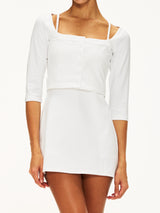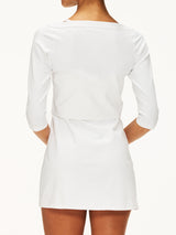 A modern take on a classic essential. The cropped, boxy silhouette and wide scoop neckline create effortless ease, while the 3/4 sleeves and button-front closure keep it versatile for layering. Made in sustainably produced, moisture-wicking fabric for elevated comfort all day.