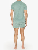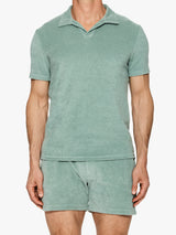 The new RD tennis polo has been designed in a lightweight, ultra-soft terry fabric made from organic cotton and recycled polyester. Terry is ideal for the beach and brings a retro touch. No zip or buttons, simply an open V-neck for a relaxed, retro look. Featuring the two discrete black-lacquered RON DORFF eyelets on the side.