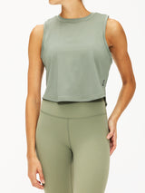 Lightweight mid-crop training tank designed with a curved hem. Made from AeroSilver®, the brand's next generation of silver-infused performance fabric, it offers enhanced durability and fiber strength to withstand intense training sessions. The tank features side splits with reinforced tack seams for added flexibility, while reflective logo details provide increased visibility during low-light workouts.