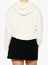 slinky softness to this hoodie while the gathered bubble hem adds a playful pop of volume.
