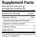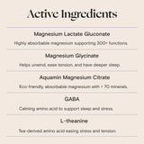Magnesium lactate gluconate, Aquamin magnesium, magnesium glycinate, L-theanine, GABA, Organic blueberry flavor, sodium bicarbonate, organic lavender flavor, spirulina powder (color), citric acid, beetroot powder (color), organic monk fruit